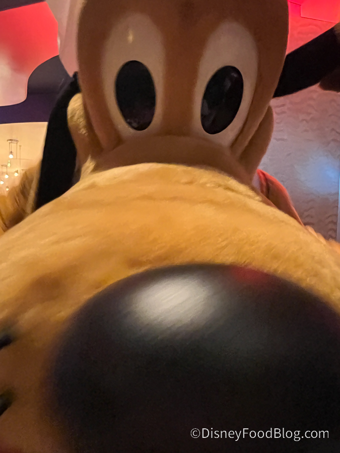 The dining areas are very colorful with lighting fixtures all around (some areas are brighter than others). However, the main draw of dining here is all the characters you can meet! While the characters can vary, I was able to meet Goofy, Pluto, Minnie, Chip, and Dale!