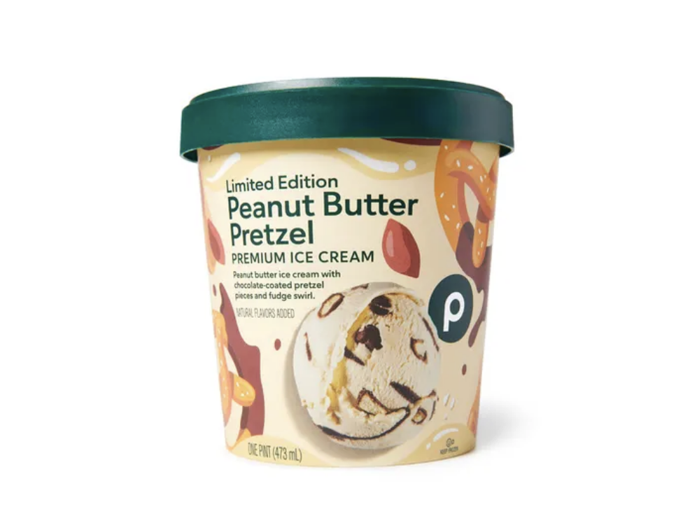 - Peanut Butter Pretzel (Peanut butter ice cream with chocolate-coated pretzel pieces and fudge swirl.)