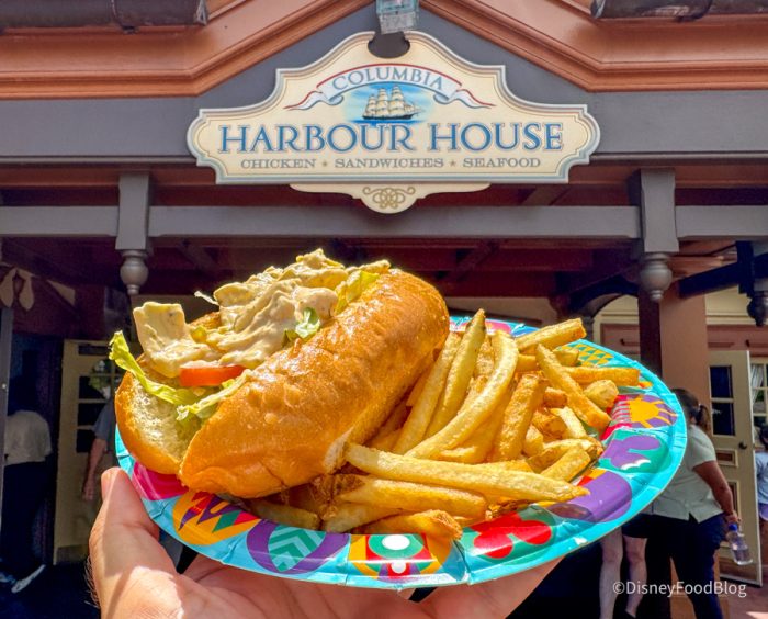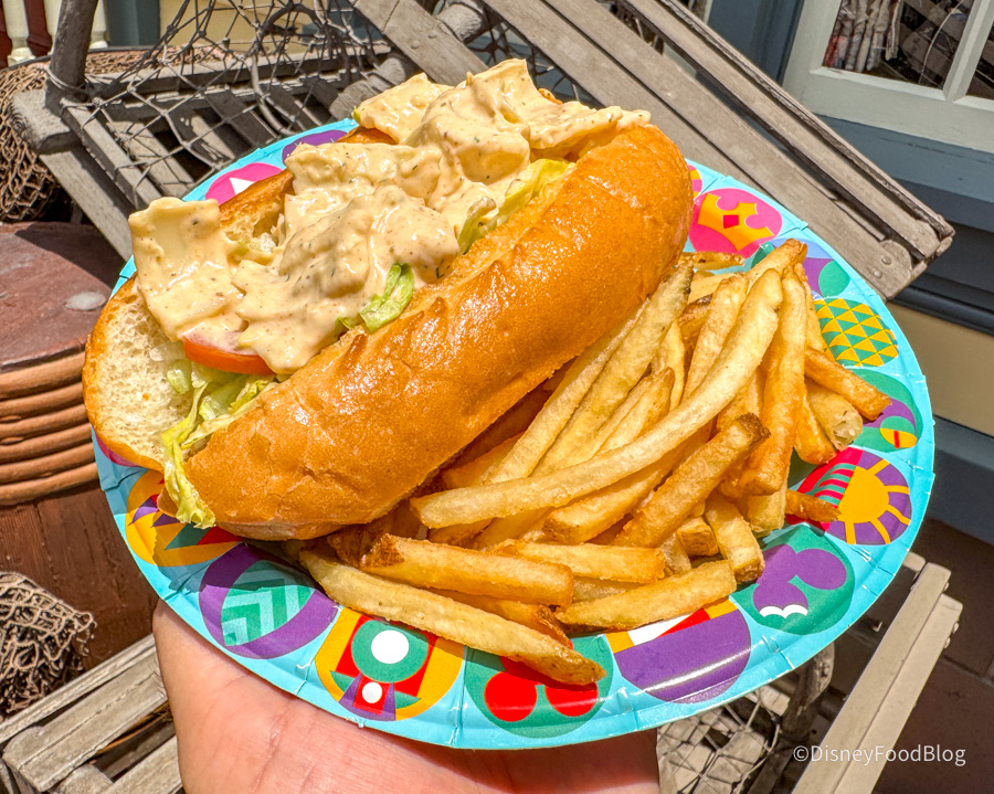 We stopped by Columbia Harbour House at Magic Kingdom to try the new Hearts of Palm and Artichoke Roll for $12.49. This comes dressed and is served chilled with lettuce and tomato on a toasted roll. It sort of reminds us of the Plant-Based Toasted “Lobster” Roll from Rosie’s All-American Cafe at Hollywood Studios, so we’re excited to try it.
