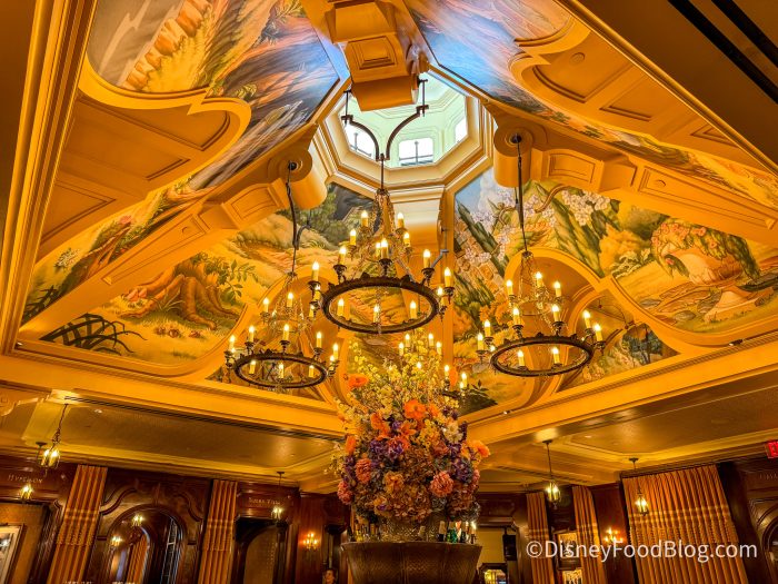 The restaurant is upstairs, and the second you step off the elevator, you know you’re not in Kansas anymore. Warm wood tones, gold accents, dramatic lighting, and even ceiling murals — it’s giving “Walt might’ve sipped a scotch here.” It’s quiet (by park standards), elegant without being intimidating, and full of details that make it feel legit special.