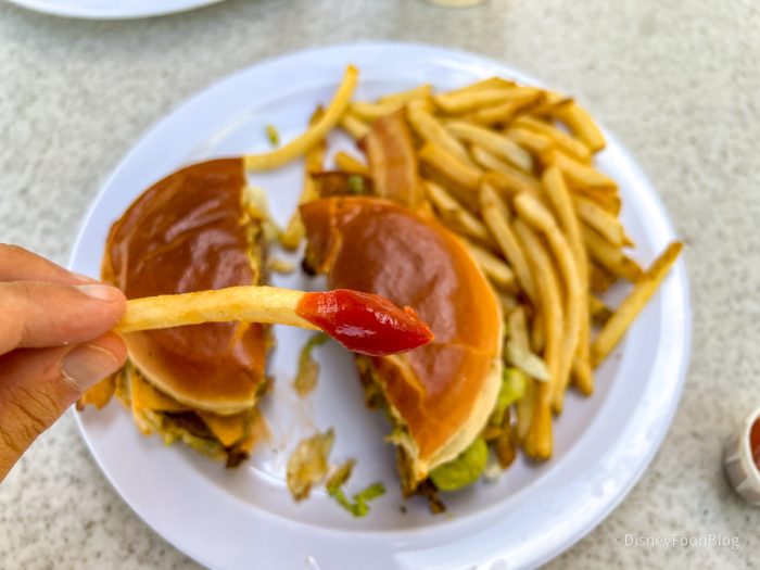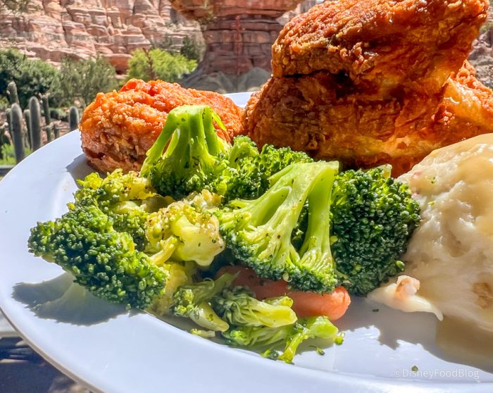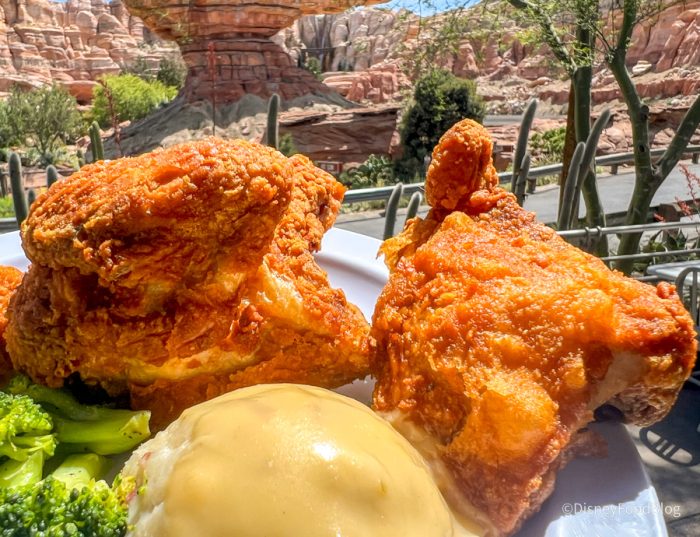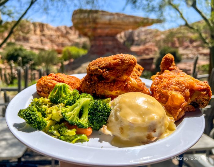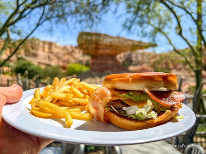 Flo’s V8 Cafe is a great spot with solid eats in Cars Land at Disney California Adventure. While the food here isn’t mind-blowingly unique, it is consistent and somewhere we come back to again and again. We appreciated the Spicy Guacamole Bacon Burger actually had a bit of a kick — and the fried chicken might give the Plaza a run for its money!