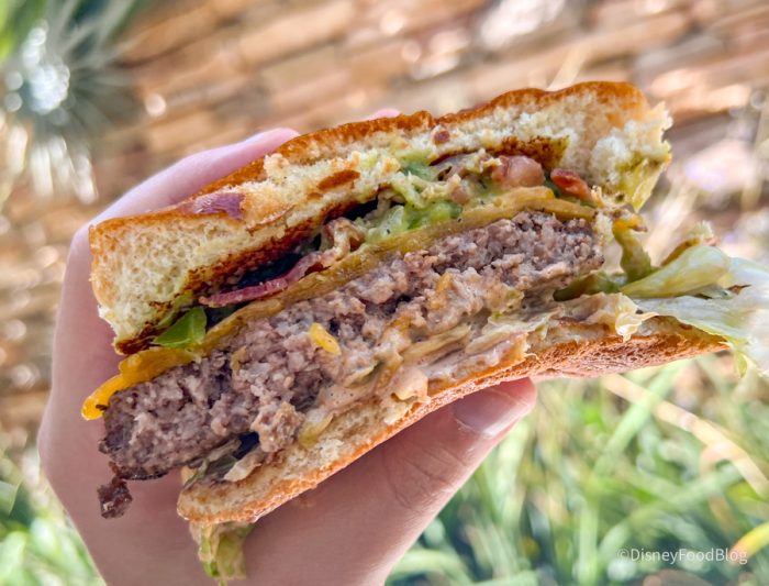 This guy has a kick! The bacon was crispy, with an ample amount of guacamole. The spice stands out, though — this is actually a spicy burger. If you can barely handle “Disney” spice, you might want to avoid this. It’s actually got a noticeable kick. The burger holds up well thanks to the sturdiness of the bun, which was thick but fresh. This burger has a lot of California flair, like the guacamole and chopped lettuce, but you should only get this if you can handle spicy food.