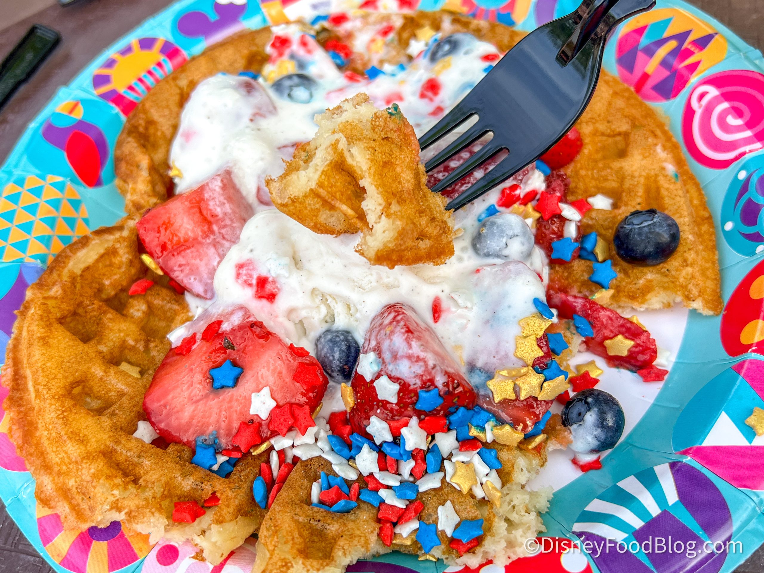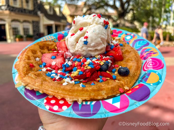 Our first stop is Sleepy Hollow Refreshments in Magic Kingdom. Here we are grabbing the Red, White, and Blue Waffle for $8.99. The waffle is topped with mixed berries, vanilla ice cream, whipped cream, and festive sprinkles. You can also get this treat in funnel cake form as well!