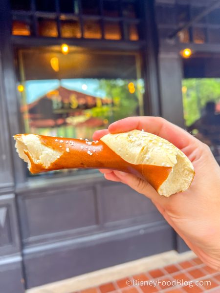 This pretzel is so big! It’s a great shareable size, and you can even ask for two sides of cheese instead of the mustard if you want. There is a lot of salt on top of each bite, and we gotta say, these are definitely better than the traditional Mickey pretzel you can get in every park. We thought it was a bit dry due to its thickness, and while we loved the flavor of the beer-cheese fondue, it came with a skin on top that we didn’t love.