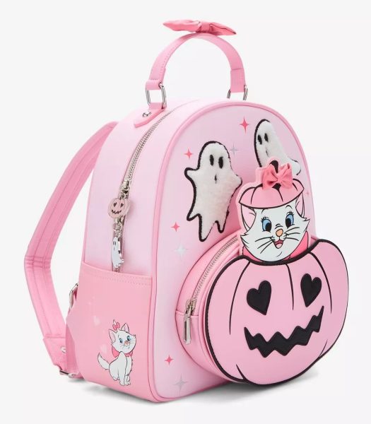 This one is giving “adorably spooky” in the best way possible. The Marie Halloween Pink Mini Backpack is all about cuteness with a Halloween twist. Marie pops out of a little pumpkin pocket on the front—yes, she’s wearing a 3D bow—and there are chenille ghost patches and sparkly printed accents all over. There’s even a zipper charm for a little extra flair. You can pair it with the matching wallet for a full Marie moment.