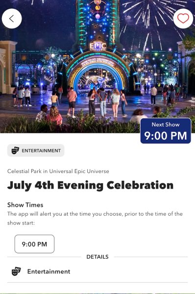While little information is provided within the app, the attached image as well as location on the park map, likely indicate a fireworks and perhaps a drone show similar to the display that coincided with the park’s official opening to the public back in May.
