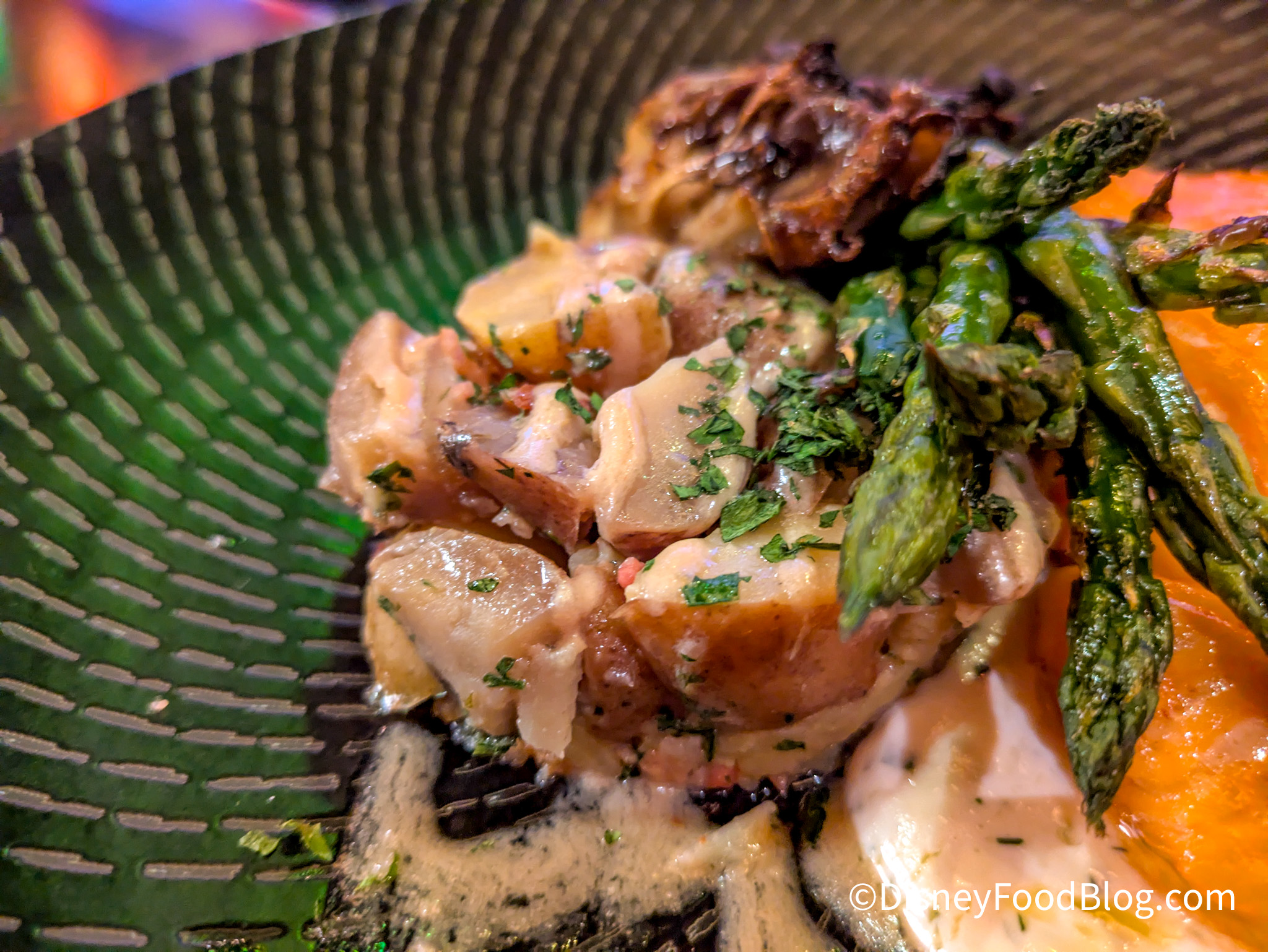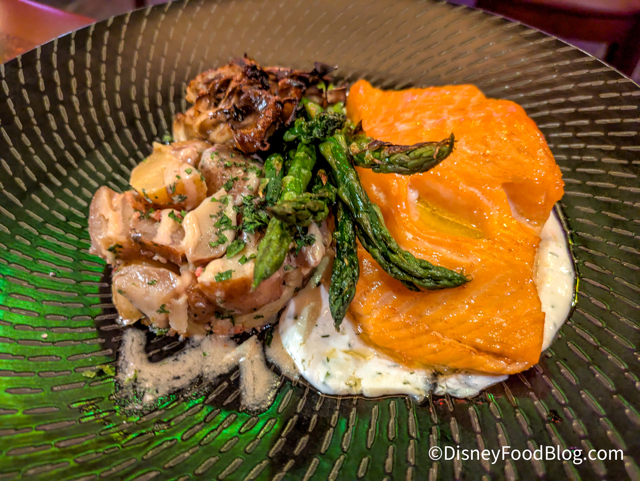 For our entree course, we ordered the House-Smoked Atlantic Salmon with applewood smoked bacon, marble potato salad, roasted asparagus, maitake mushrooms, and lemon-dill cream.