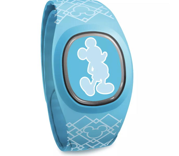 If you want something a little more classic but still bright and colorful, the Mickey Mouse Silhouette MagicBand+ is the way to go! It’s a beautiful light blue color with a geometric pattern on the band (complete with Mickey silhouettes), and Mickey on the tapping part of the band.