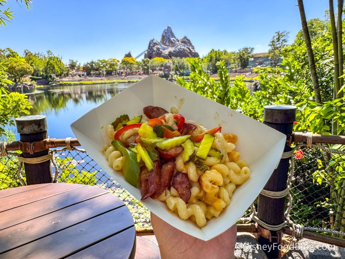 Disney’s Animal Kingdom might be one of our favorite places to grab snacks. Over at The Smiling Crocodile, there were three new macaroni and cheese dishes we tried. There are currently three options available: Baked Macaroni & Cheese, Baked Macaroni & Cheese with Buffalo Chicken, and Baked Macaroni & Cheese with Garlic Smoked Sausage.