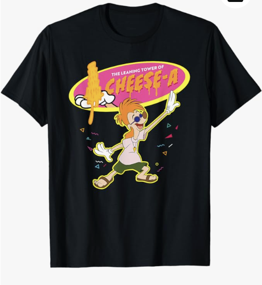 Celebrate the 30th anniversary of Disney’s animated “A Goofy Movie” with this official Disney tee, featuring a retro, totally Nineties image of Bobby and his unforgettable spray-cheese creation, “The Leaning Tower of Cheese-a”.