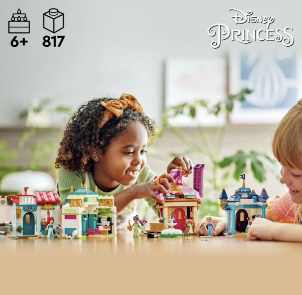 This 817-piece set builds out Includes 4 buildings, a smaller area with a flowerpot, bench and fountain, plus Ariel, Aurora, Cinderella and Tiana LEGO Disney Princess mini-doll figures.