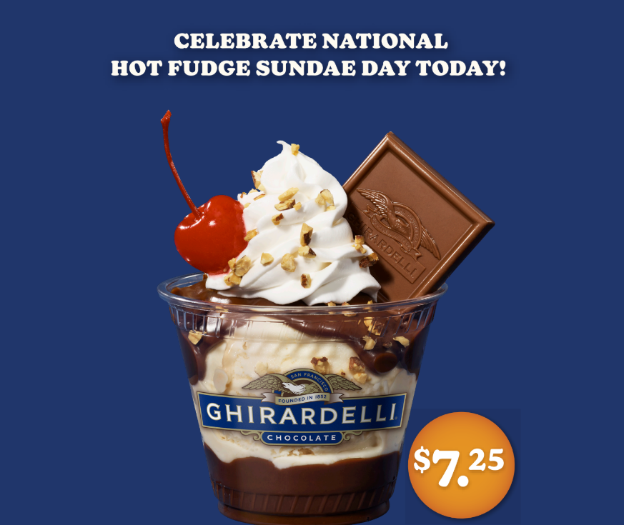 Ghirardelli’s Mini Hot Fudge Sundae is made with a scoop of vanilla ice cream and handmade hot fudge topped with whipped cream, diced almonds, a cherry, and a Milk Chocolate Caramel Square. YUM. So if you have a sundae craving on July 25th, you know where to go!