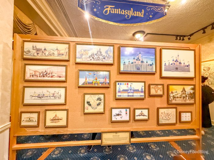 Before we get started with the show, let’s talk about the Opera House itself! Exhibits inside the Opera House have changed. The front lobby has an exhibit on the construction of Disneyland with dozens of framed pieces of concept art, divided by land. There are some rarely exhibited pieces, including some of the Main Street, U.S.A. facades that a Cast Member said are on tissue that is so delicate they don’t want to handle it too much.