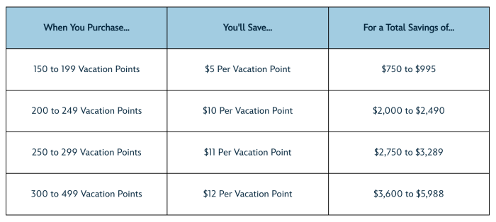 - If you buy more points, say 200 to 249 Vacation Points at $30 per Vacation Point, you’ll save between $6,000 and $7,470