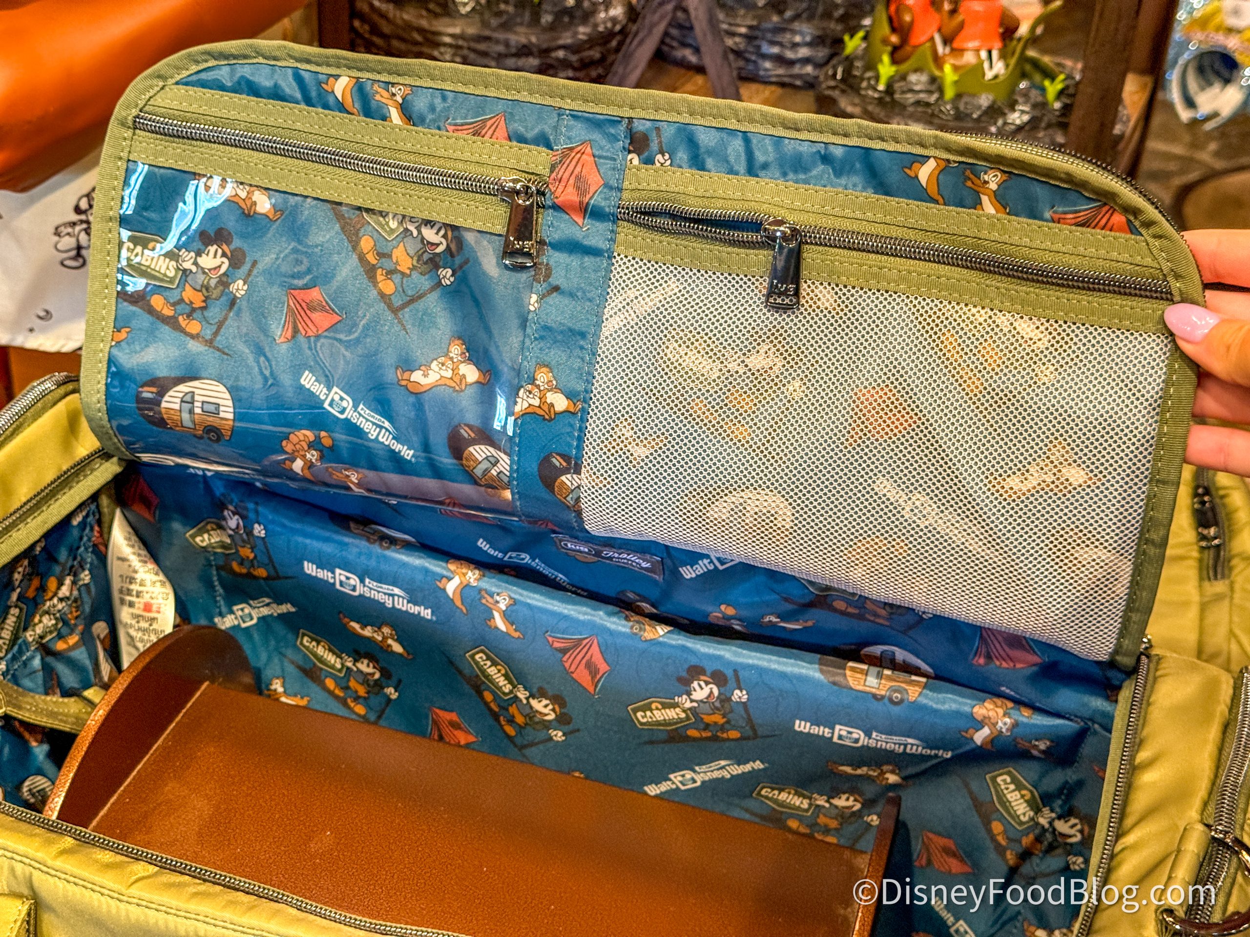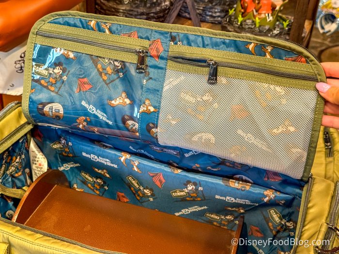 The bag is a green color that is perfect for the nature vibes and features patches on the outside. The inside has an adorable fabric pattern with Mickey Mouse, Chip, and Dale. This duffle bag has SO many pockets. Everywhere we looked we spotted another one, which is perfect for organizing your belongings.