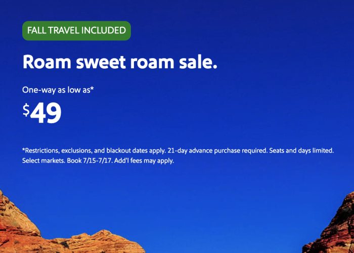 Hurry! Southwest is having a “Roam Sweet Roam” sale offering one-way flights for as low $49. There is a 21-day advance purchase required, and the sale ends on July 17th at 11:59 PM. If you’re looking to score a cheap flight for the second half of 2025 into early 2026, now is the time!