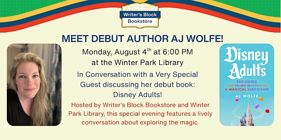 Yes, that’s right. You can attend a special Disney Adults book launch party with AJ on August 4th at 6 PM hosted by Writer’s Block Bookstore at Winter Park Library in Winter Park, FL (that address is 1052 West Morse Boulevard, if you need it). You’ll get to celebrate the book’s release, meet AJ, and attend a special conversation about the book.