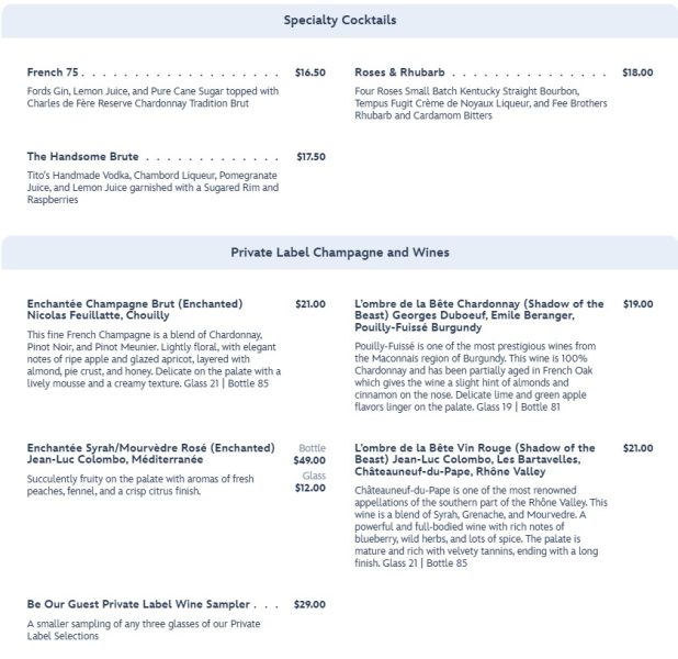Like we mentioned before, Be Our Guest offers a prix fixe menu. You pay one price and get to choose an appetizer, entree, and dessert. There are additional enhancements and drinks you can add one as well. Both lunch and dinner cost the same, so no matter what time of day you are at Be Our Guest, you will be paying $72 per adult and $43 per child. We are here to check out some of the new menu items — as well as some menu items that got some updates!