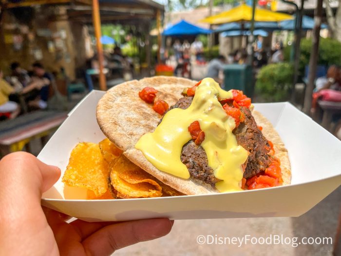 The dining spot is open from 10:45 AM to 3:15 PM. The markets got some great options for meals, snacks, desserts, and drinks — we’re sure you’ll be intrigued by something. Harambe Market is known for its bowls! You can get a Chicken Rice Bowl or a Shrimp Rice Bowl. If you can’t decide, put them together for a Chicken Shrimp Rice Bowl. You’ll also find some salad options and a Beef and Lamb Kofta Pita. If you want something plant-based, the Impossible Kofta Pita is for you!