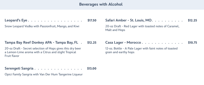 They have both alcoholic and non-alcoholic beverages available at the location. The non-alcoholic Frozen Flamingo seems like a popular choice among guests. We also think there are some intriguing alcoholic beverages.