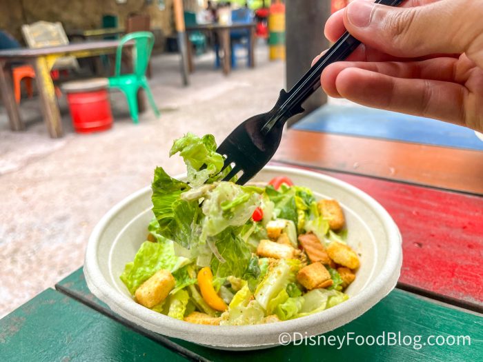 To be honest, this was a big salad! You could definitely have this as its own dish if you wanted to. They had a protein option, which was a chicken Caesar salad — we’d probably get that instead. The lettuce was fresh and crunchy, and the croutons were very crunchy. There wasn’t too much dressing, so it didn’t make the salad soggy, which we liked.