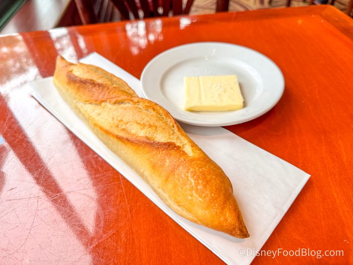 You get a whole baguette with a light, sourdough-like tanginess, served with butter and chunks of salt. The bread is nice and crispy, but the inside is so soft and fluffy, and the contrast of the two textures gives it a great chew. The bread is baked fresh from Les Halles, also located in the France Pavilion, and you can taste the freshness.