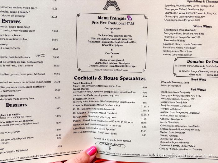 If you’re looking to dine on a budget, you can also try their prix fixe Menu Français, which comes with an appetizer, entrée, dessert, and beverage, all for $67.95. We opted to order dishes individually because the Annual Passholder discount cannot be applied to the prix fixe menu.