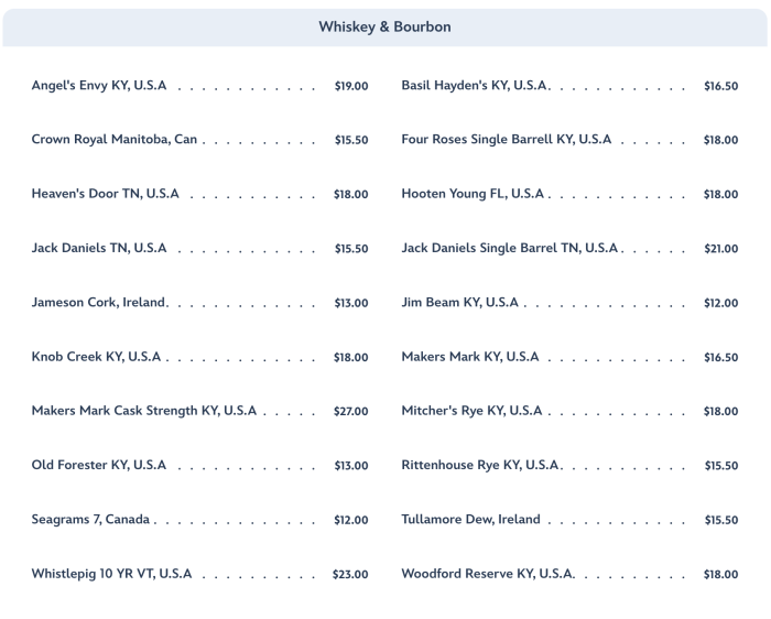 …and then we dive into the long list of Whiskey and Bourbon selections…