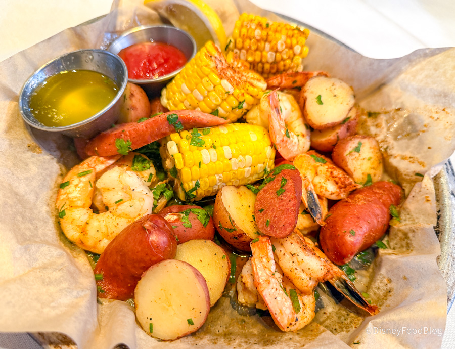 We also ordered the Dockside Shrimp Boil for $27.50. This meal consists of Corn on the Cob, Red Potatoes, Andouille Sausage, and BOATHOUSE Seasoning.