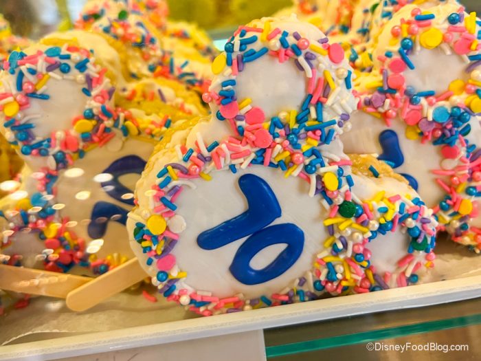 But we’re not done. We stuck around at Candy Palace to get two more snacks, including the 70th Celebration Mickey Cereal Treat for $8.49. It’s basically a crispy rice cereal treat dipped in peanut butter coating and decorated with dark chocolate and sprinkles. Is it basic? Yes. Is it tasty? Also, yes. Is it Fun? Yes! Yes! Yes!