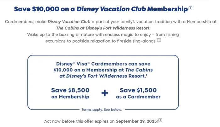 This offer expires on September 29th, 2025, so you’ll want to act fast if it’s been on your mind! You do have to take part in the “tour” for DVC, either in person or over the phone, and in order to qualify for the deal, you’ve got to buy an ownership interest with at least 250 Vacation Points in The Cabins at Disney’s Fort Wilderness Resort. Typically, all together, a deeded ownership interest in a Disney Vacation Club Resort is priced at $24,500 to $61,250, but that is subject to change and does not include these savings.