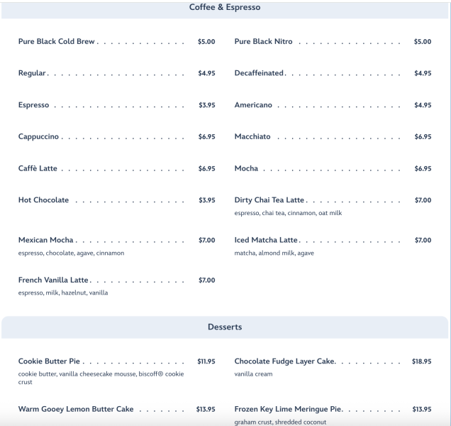 Coffee, espresso, and desserts round out the main menu offerings.