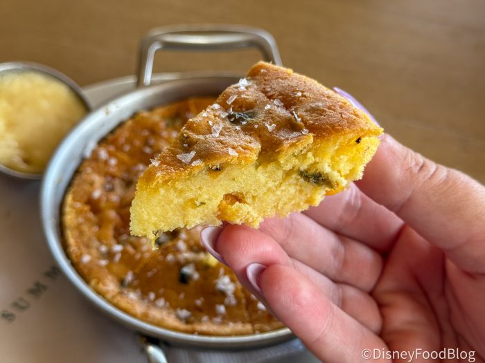 Alright — immediately our mouths were watering at the mere sight of this thing and we couldn’t get over its massive size! The cornbread in the skillet is served warm to the touch when it’s brought out, so you’ll want to be careful if you plan on relocating it around the table. As for how it tastes, well, it might as well literally melt in your mouth! It’s truly a masterpiece of sweet cornbread, similar to the ones served at Flame Tree Barbecue in Animal Kingdom, only a lot more moist and just folds right in with each bite.