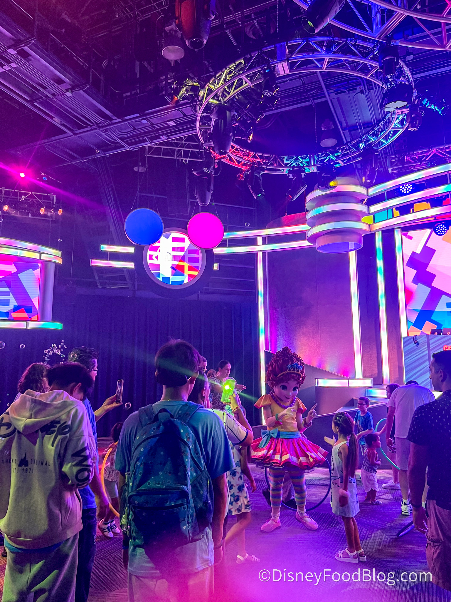 Get Animated! is a DJ-led dance party that takes place throughout the day. You can hang out and dance with characters like Timone, Vampirina, Pluto, Fancy Nancy, and Mickey from Roadster Racers.