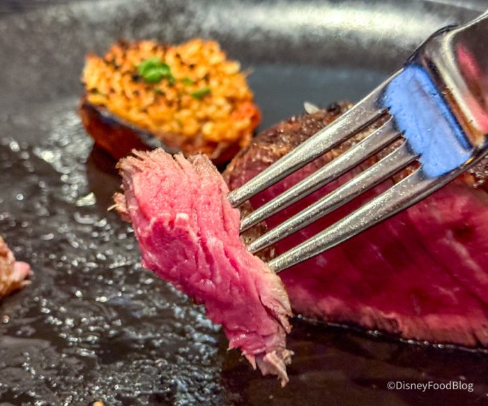 This was an INCREDIBLE steak. One of the best we’d had in years — in or outside of Disney parks. There was a beautiful crust on the outside with a pleasant saltiness, and it was perfectly cooked to order at medium rare. We’ve had some medium rare filets lately that had a bit of a chewiness, and this had NO chewiness. It was like butter to cut through and chew. Incredible flavor. If you want a steak in Disney World, we think you need to come here. It is classic steakhouse style, so you get pretty much just the steak.