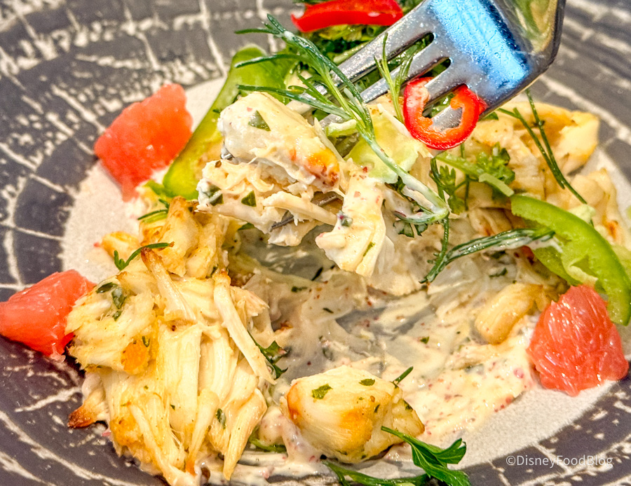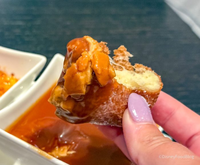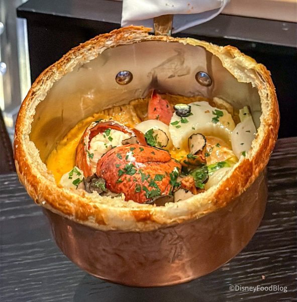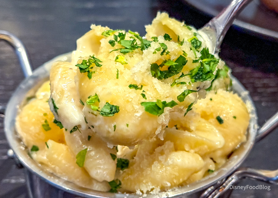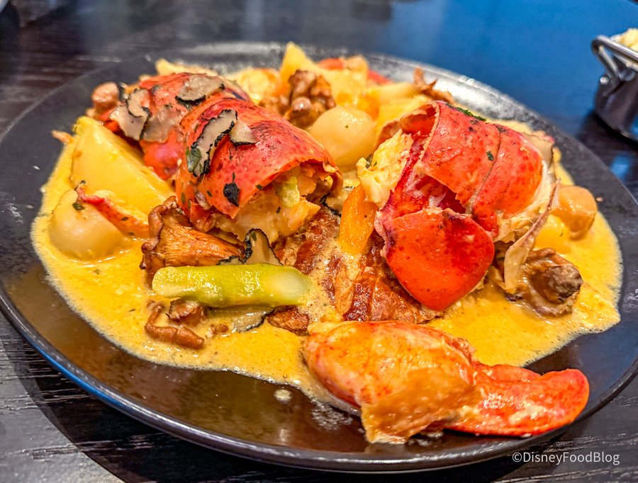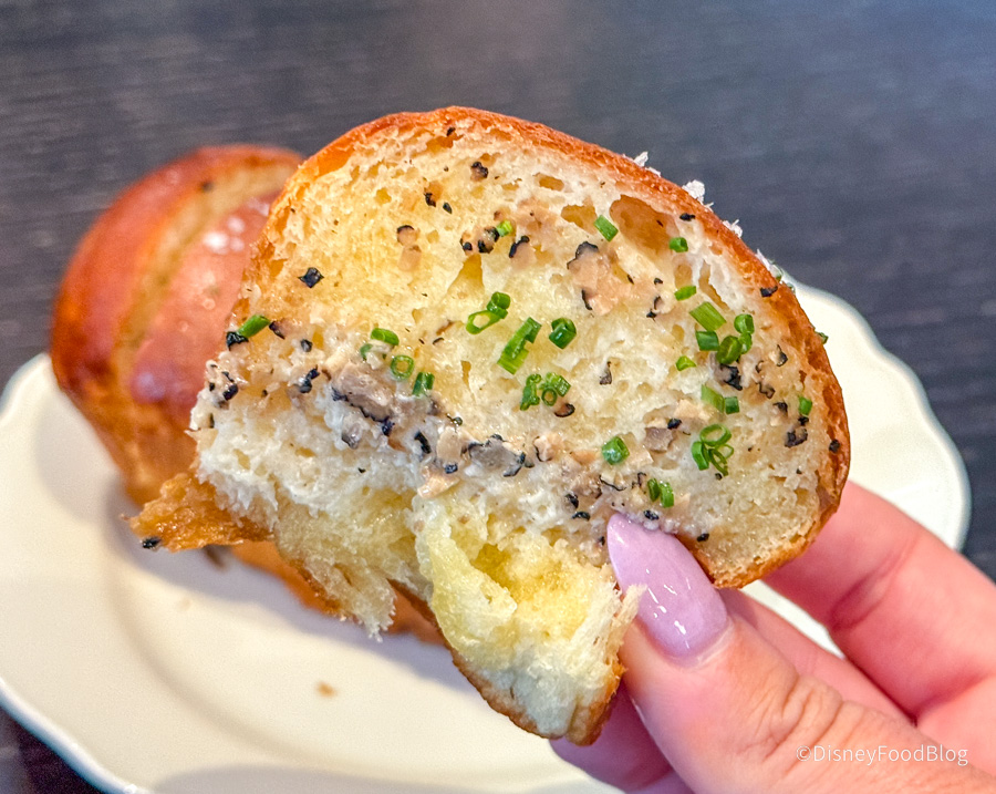 This was maybe some of the best bread we’ve ever had at Disney World, and we’ve had LOTS of bread at Disney World over the years. We don’t love the idea of paying $14 for bread, but after eating this — we would do it again in a heartbeat. They’re basically Parker House rolls with black salt, herbs, and truffle butter soaked into the bread. One of our reporters ate four pieces of this and had zero regrets. Imagine a super elevated garlic knot — it was SO good.