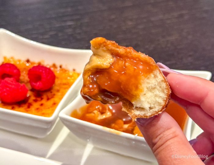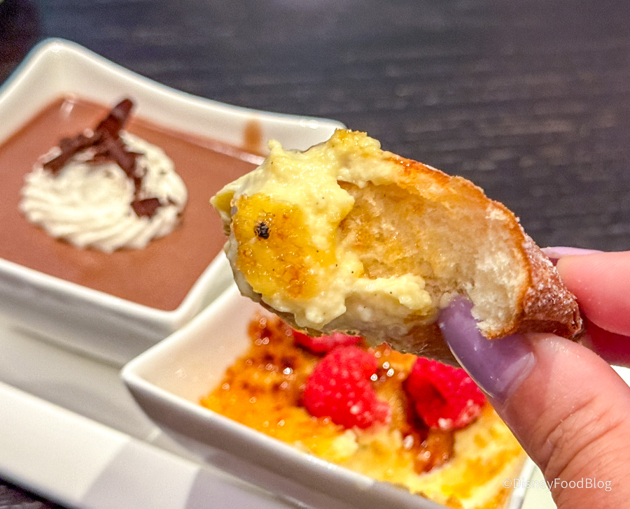 Finally, it was time for dessert — so we ordered the Warm Beignets & Dipping Custards for $19. These are served with Macallan 12 Year butterscotch pudding, crème brûlée with fresh raspberries, and milk chocolate pot de crème.