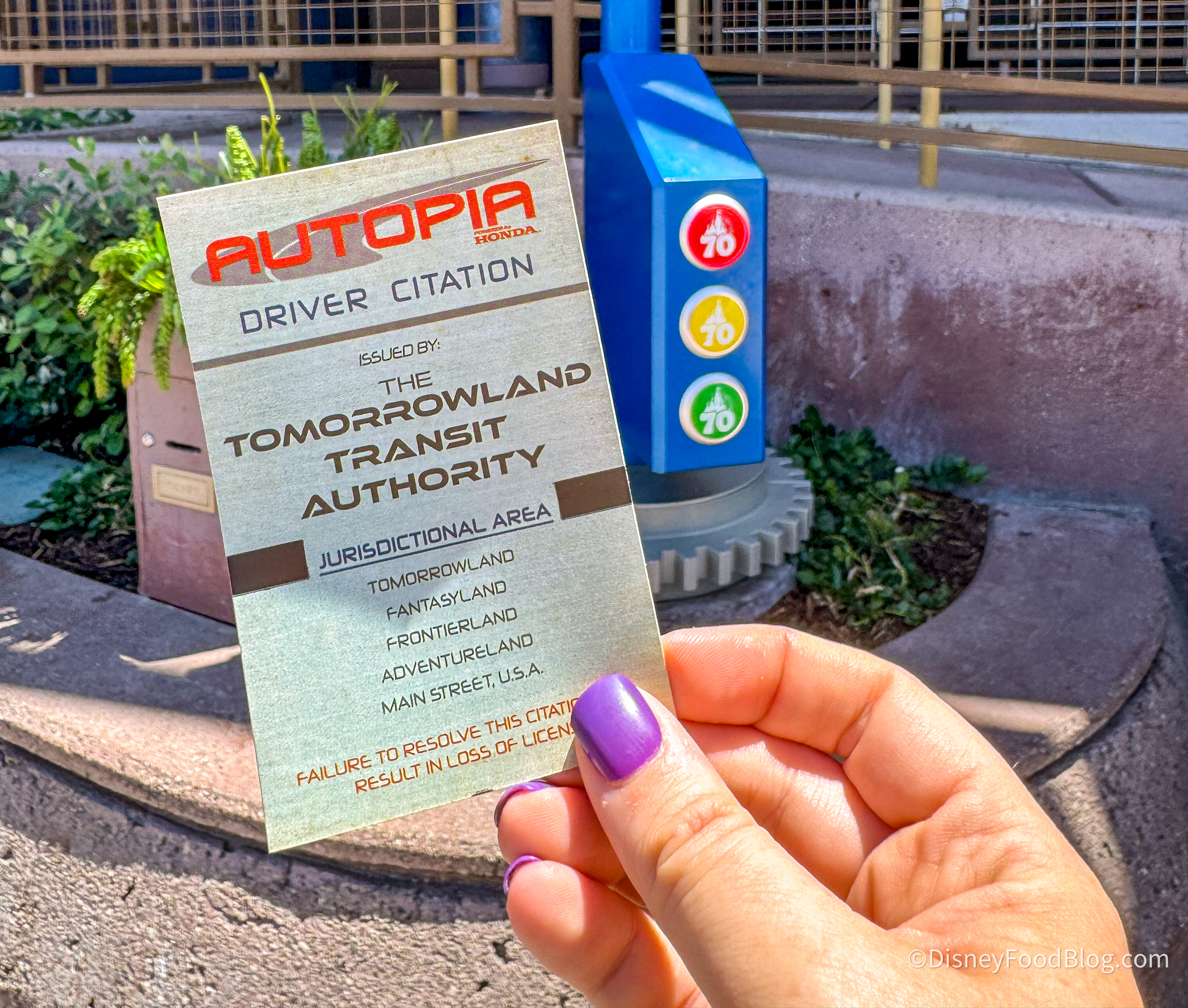 Over near Autopia, you’ll see a stoplight that looks like you can touch your MagicBand+ against each circle. However, since the celebration began, all we’ve heard are car sounds when we tapped against it. That’s all changed now, because now you get a ticket!