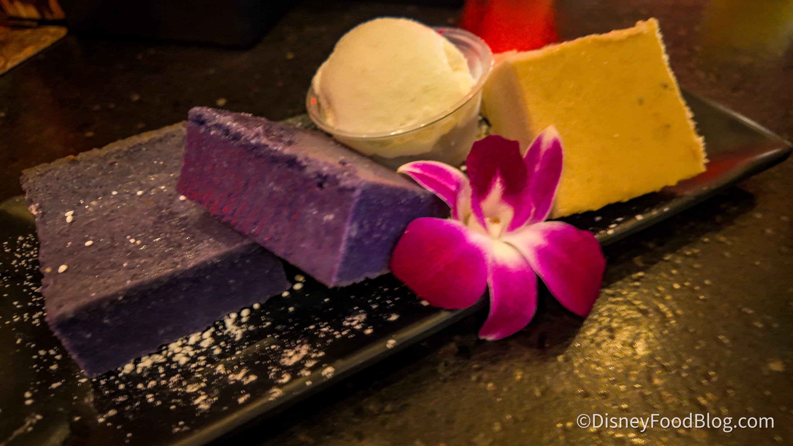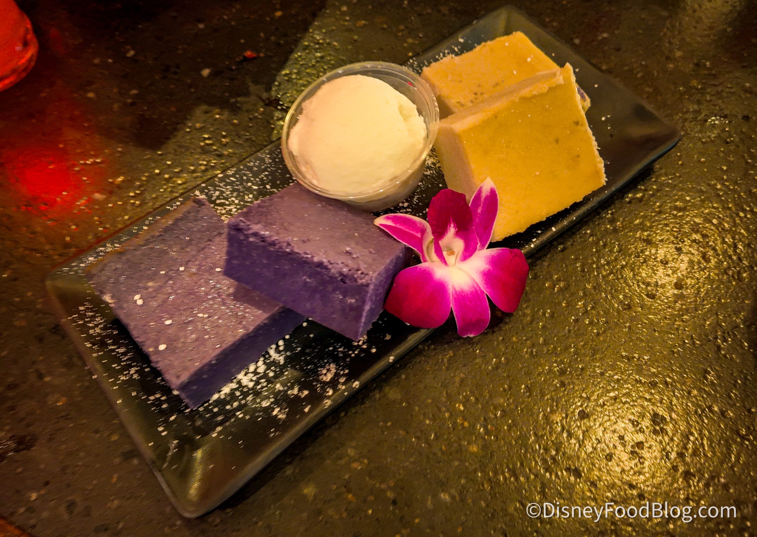 The ube bars were hard as a rock and the texture was gritty and off-tasting. The mochi bars had a waxy consistency that reminded us of hard jelly. The flavors and textures throughout this whole dish were a big miss. Our reporter is a huge fan of mochi ice cream, and they could barely eat any of this dessert.