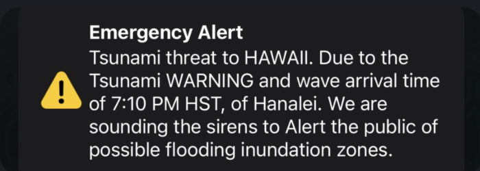 An emergency alert was issued to Hawaiian residents, stating, “Due to the Tsunami WARNING and wave arrival time of 7:10 PM HST, of Hanalei. We are sounding the sirens of Alert to the public of possible flooding inundation zones.” An advisory was also issued for Japan’s Pacific Coast regions from Hokkaido to Kyushu.