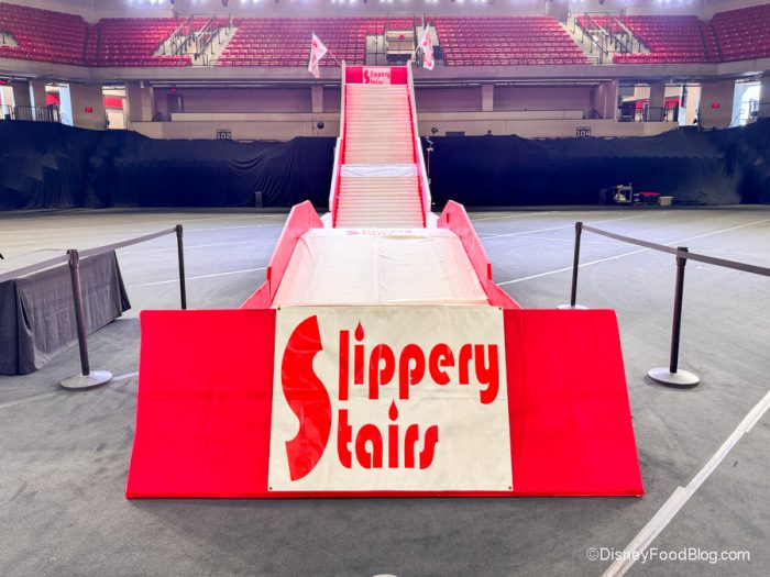 Now, though, we’re moving on to what could be our new favorite sport to watch. It’s called Slippery Stairs, and yes, it’s EXACTLY how it sounds. So there are all these staircases of different shapes and sizes, and some are even tilted at different angles. But the best part is that there’s a slippery substance on the stairs. So competitors put on suits and try to climb to the top of the stairs…and y’all, it is HILARIOUS.