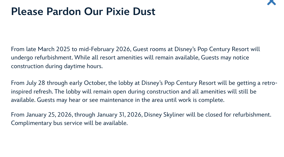 The Disney World website indicates that from July 28th through October, the lobby at Disney’s Pop Century “will be getting a retro-inspired refresh.” The lobby will remain open during this time, although you may see and hear construction. All hotel amenities will also be available.