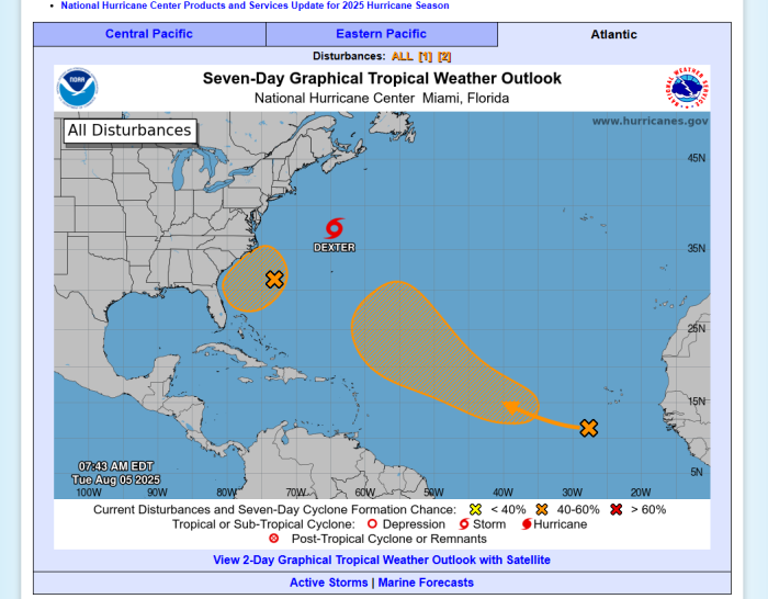 On top of Dexter, the National Hurricane Center has been monitoring a tropical wave in the far eastern tropical Atlantic. There is a chance of a gradual development of the wave, and a tropical depression could form late this week as it moves west-northwestward across the central tropical Atlantic. The chance of formation within the next 48 hours of today is still zero percent; however, a formation chance in the next seven days is 50%.