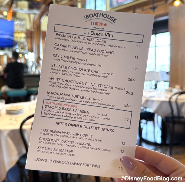 There is no shortage of great restaurants in Disney Springs, with options to match pretty much whatever you’re craving! If you’re in the mood to treat yourself, The BOATHOUSE is a signature restaurant known for its steaks, chops, and seafood. But the fun doesn’t stop at the savory stuff! You can also find unique menu items here, like the adorable Duck Duck Razz cocktail and delicious desserts…like the massive NEW one we just tackled!