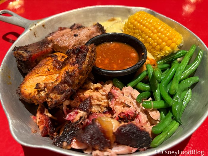 For our main meal, we grabbed the Traditional All-You-Care-To-Enjoy Signature Skillet. This costs $43, but you can get as many of the different items as you want. The skillet features oak-smoked beef brisket, pork ribs, slow-smoked pulled pork, citrus-herb chicken, western-style sausage, smashed potatoes, baked beans, buttered corn on the cob, and sautéed green beans. The price for this meal is per person, but everyone participating in the skillet will have dibs to grab from the overall meal placed at the table.