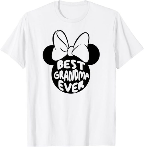 Loud and proud. If your Disney Grandma is the type who carries the entire family vacation on her back (and probably planned it six months in advance), this is her shirt. It reads “Best Grandma Ever” front and center with Minnie’s head icon and a bow, because she deserves that recognition while she’s out here organizing Lightning Lane plans like a pro. This one’s super popular right now in the parks—we’ve seen it in matching sets and even paired with some fun polka dot Minnie ears. You can dress it up or down depending on the park schedule.
