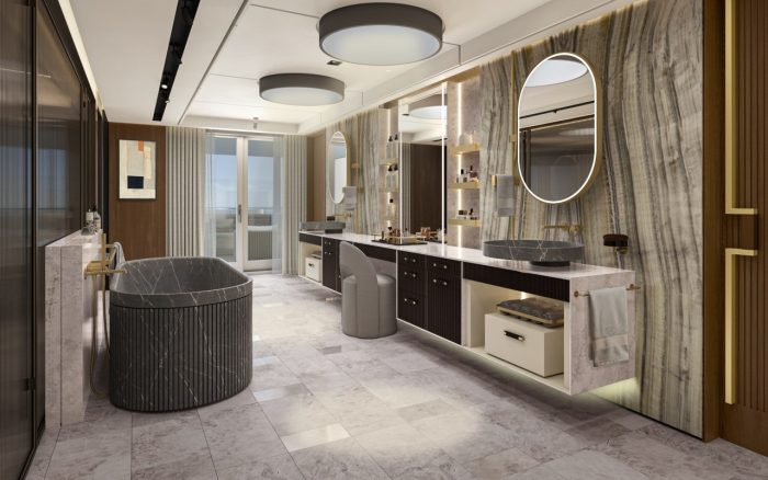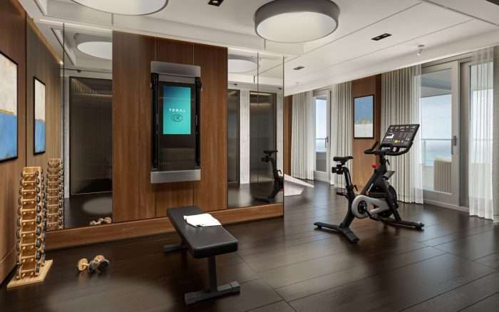 There’s a floating natural stone staircase AND elevator (!!!) that leads to the second floor, which has a spa-inspired bathroom, a handcrafted Italian bed, a walk-in closet, a dedicated massage room, and a personal gym. Y’all…we would never leave these rooms…EVER. They’d have to drag us off the cruise.