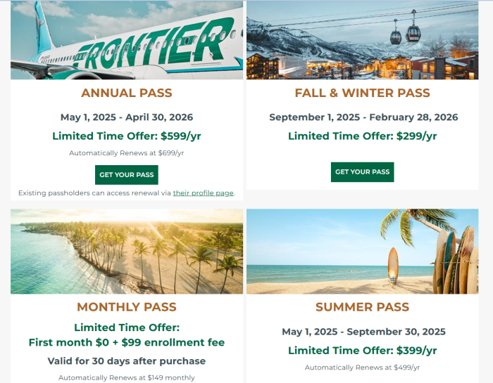 The Fall & Winter deal is only one of the flight offers available. There are also three other current offerings available. The Monthly Pass is available for $0 plus a $99 Enrollment Fee and is valid for 30 days after purchase (will renew for $149 after 30 days), the Summer Pass was available from May 1st-September 30th, 2025 for $399, and the Annual Pass is valid through April 30th, 2026 and will cost you $599 a year (will renew at $699 a year).