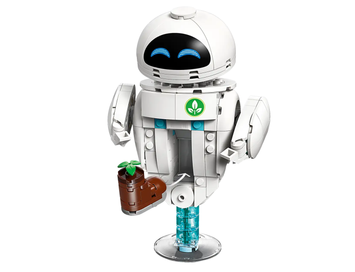 The set comes with pieces to build WALL-E, EVE, M-O, and Hal, plus the plant-filled boot. And naturally, the boot even fits in the EVE storage compartment — iconic! This build is designed for adults and comes with 811 pieces total.