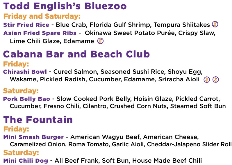 You can taste the Stir Fried Rice and Asian Fried Spare Ribs from Todd English’s Bluezoo, and from Cabana Bar and Beach Club, you can try the Chirashi Bowl on Friday and the Pork Belly Bao on Saturday. From The Fountain, you can grab a Mini Smash Burger on Friday and a Mini Chili Dog on Saturday.